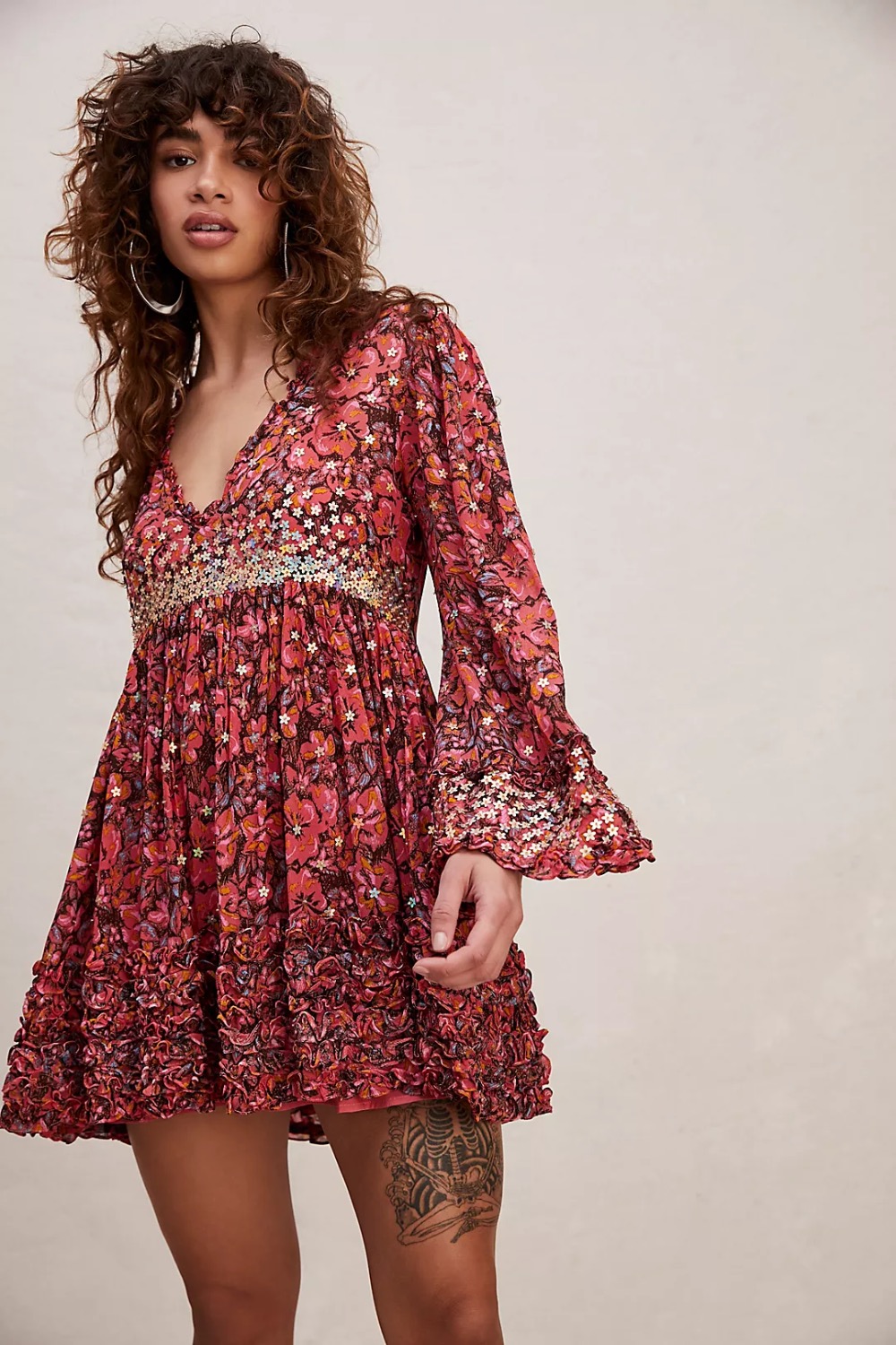Product Name: Kristall berry red floral print bell sleeve mini dress free people shop
